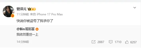 虎扑02月06日讯 管泽元转发Bin社媒:快说你被盗号了我求你了